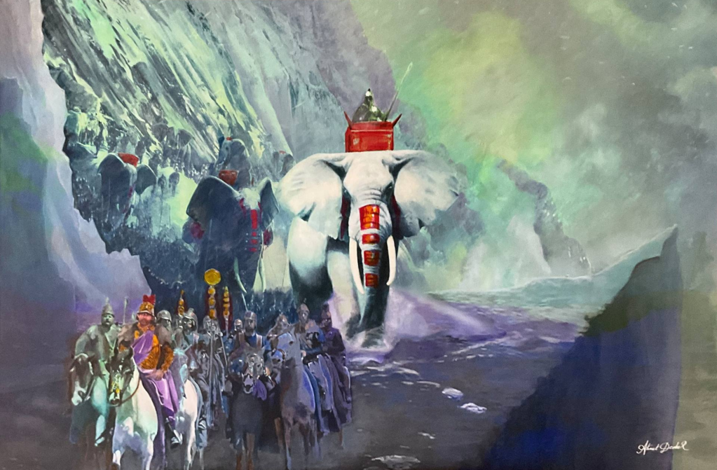 In this painting, I have sought to capture the essence of one of history’s most audacious and legendary feats: Hannibal’s Alpine triumph in 218 BC. At the forefront of the canvas, Hannibal Barca, the legendary Carthaginian leader, commands attention astride his magnificent steed. Clad in regal armor and draped in the purple of royalty, he exudes an aura of stoic determination. His eyes blaze with fierce resolve, his mind focused on the colossal task ahead. His generals, both weary and valiant, trudge alongside their commander. In the middle of the canvas, among the soldiers, a massive war elephant lumbers. This majestic beast, despite its massive size, appears vulnerable against the backdrop of the mighty Alps. The unforgiving majesty of the Alps emerges in the background, their icy peaks are adorned with a glistening mantle of snow. The swirling winds and snowstorm only amplify the sense of harshness and danger that awaits those who dare to traverse these treacherous heights. The scene is bathed in a chiaroscuro of light and shadow, emphasizing the stark contrasts between strength and vulnerability, triumph and defeat.