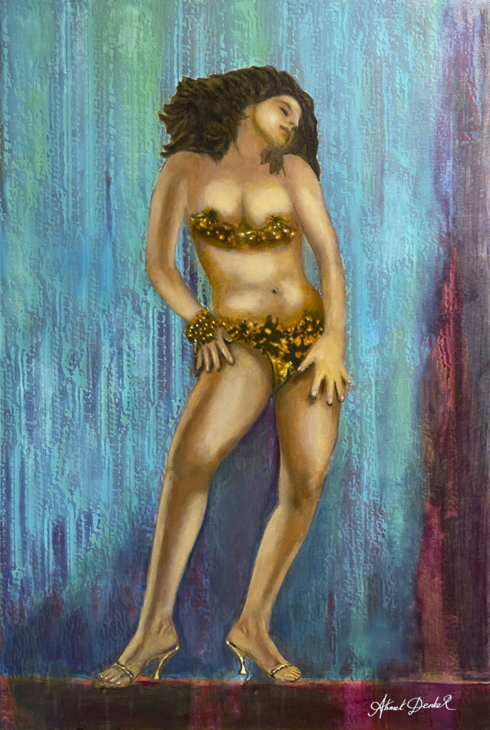 Salome has inspired artists including Titian and Moreau over the years. Here, I have endeavored to reflect her statuesque body during her legendary dance which entices one to gaze with a contemporary interpretation.